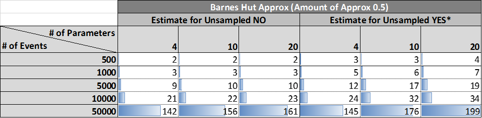 We then repeated the previous tests by enabling the Estimate t-SNE for Unsampled Events option. By enabling this option, the events that did not participate in the t-SNE calculation will be mapped to the nearest point that did participate in the t-SNE mapping. With the file used for this test, the estimation had been performed on almost half a million of events. The result of these tests can be seen in the table and scatter plots below.