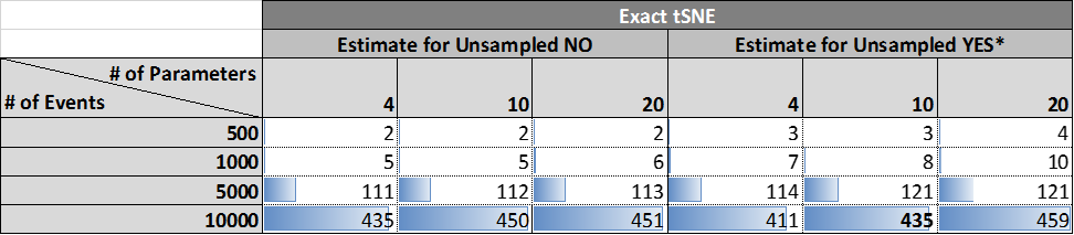 The table below shows the elapsed time (in seconds) for t-SNE calculation using the Barnes-Hut Approximation (Amount of Approximation = 0.5)with a different combination of number of considered events and number of considered parameters. In these tests, t-SNE was not estimated for unsampled events. Please refer to the Defining a t-SNE Transformation section in the software reference manual for more information about the methods and options that are available in FCS Express.
